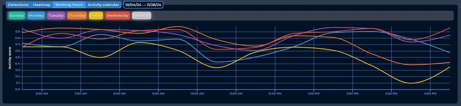 Statistiques d’activités et des détections par période, heure, jour.